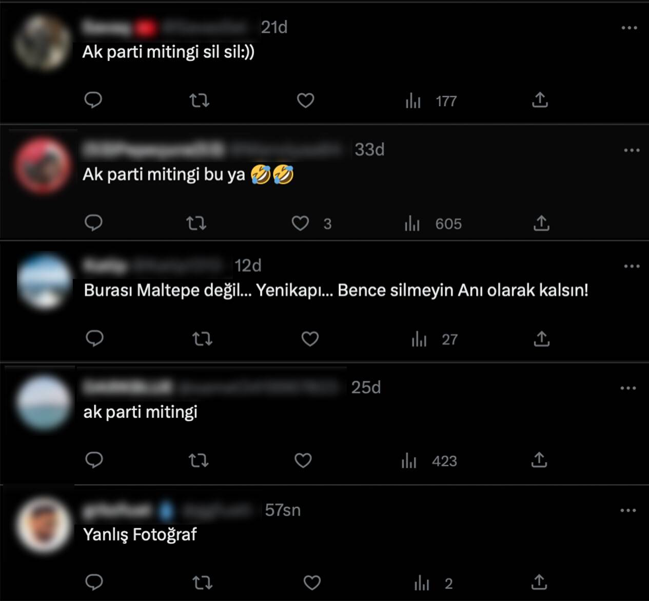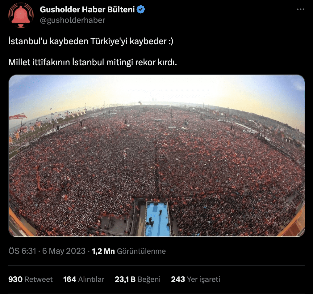 Sosyal medyada milyonlarca takipçisi olan hesaplar tarafından bir miting alanını tamamen doldurduğu görülen vatandaşların fotoğrafı paylaşılarak, görselin Millet İttifakı'nın İstanbul Maltepe'de düzenlediği "Büyük İstanbul Mitingi"ni gösterdiği iddia edildi. Paylaşım kısa sürede çok sayıda beğeni ve etkileşim alarak, sosyal medyada gündem oldu.