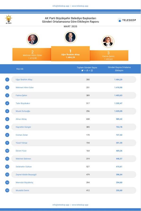 Ak Parti Belediyelerinin ve Belediye Başkanlarının Mart ayındaki sosyal medya karnesi yayınlandı. En çok gönderi etkileşimini Ak Parti Konya Büyükşehir Belediye Başkanı Uğur İbrahim Altay aldı.