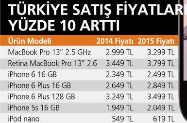 Apple, 2015'in ilk dakikalarında Türkiye'de satışa sunduğu ürünlerin fiyatlarını yüzde 10'a varan oranda artırdı. Fiyatlara 60 ile 300 liralık zam anlamına gelen bu artışların yanı sıra şirketin ayrıca 9 takside kadar olan fiyatlamayı 5 takside indirmesi dikkat çekti. Yapılan son düzenlemelerle birlikte Apple telefonda Avrupa ülkeleri ile başa baş olan fiyat farkı 600 liraya kadar çıktı.