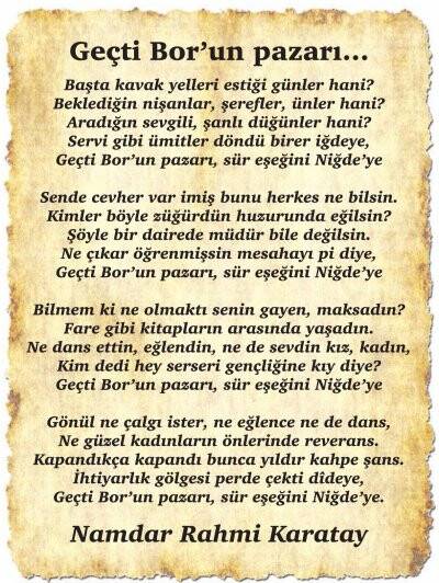 Evet evet hepimizin çok iyi bildiği çok hoşuna gittiği “Geçti Bor’un Pazarı” şiirinin şairi Namdar Rahmi Karatay’ın gelini imiş meğer bizim meşhur hoca…
