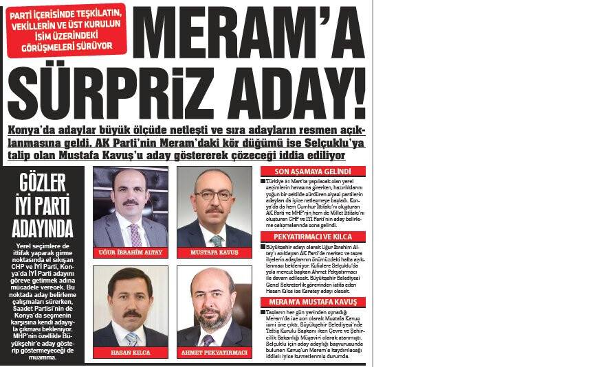 Yerelde en iyi yapmanın çabası içerisinde 21 Aralık tarihindeki manşetimizde Meram’daki kavgayı, gürültüyü, tartışmayı bitirecek ismin “Mustafa Kavuş” olduğunu belirtmiş Mustafa Başkan’ın fotoğrafını yayınlayarak Meram’ın adayının sayın kavuş olduğunu ilk biz yazmıştık çok şükür.