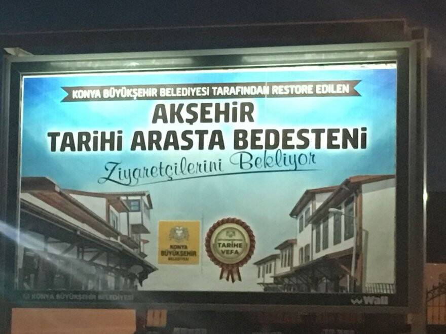 Büyükşehir Belediyesi Konya Mengüç yerine burada bilbordlarda Akşehir Bedesten Çarşısı’nın reklamı yapıyormuş.