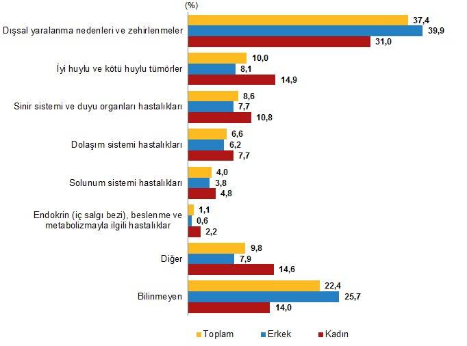 Ölüm nedenleri cinsiyete göre incelendiğinde, dışsal yaralanma ve zehirlenmeler nedeniyle hayatını kaybeden genç erkeklerin oranı %39,9, genç kadınların oranı %31,0 oldu. İyi huylu ve kötü huylu tümörler nedeni ile hayatını kaybeden genç erkeklerin oranı %8,1, genç kadınların oranı %14,9 oldu.