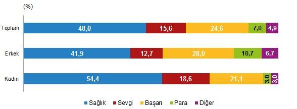Yaşam memnuniyeti araştırması sonuçlarına göre 2020 yılında gençlerin mutluluk kaynağı olan değerler arasında %48,0 ile sağlık, ilk sırada yer aldı. Bunu, %24,6 ile başarı, %15,6 ile sevgi izledi. Mutluluk kaynağı cinsiyete göre incelendiğinde, genç erkeklerde %41,9 ile ilk sırayı sağlık alırken bunu %28,0 ile başarı ve %12,7 ile sevgi takip etti. Genç kadınlarda ise %54,4 ile ilk sırayı sağlık alırken bunu %21,1 ile başarı ve %18,6 ile sevgi takip etti.