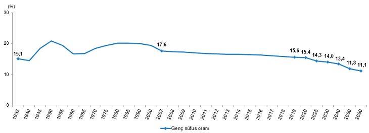 Nüfus projeksiyonlarına göre genç nüfusun toplam nüfus içindeki oranının 2025 yılında %14,3, 2030 yılında %14,0, 2040 yılında %13,4, 2060 yılında %11,8 ve 2080 yılında %11,1'e düşeceği öngörüldü.
