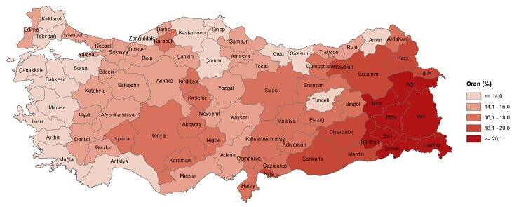 ADNKS sonuçlarına göre 2020 yılında genç nüfus oranının en yüksek olduğu il, %23,4 ile Hakkari oldu. Bu ili %22,5 ile Şırnak ve %21,8 ile Siirt izledi. Genç nüfus oranının en düşük olduğu iller ise sırasıyla, %12,5 ile Muğla, %12,8 ile Sinop ve Balıkesir oldu.