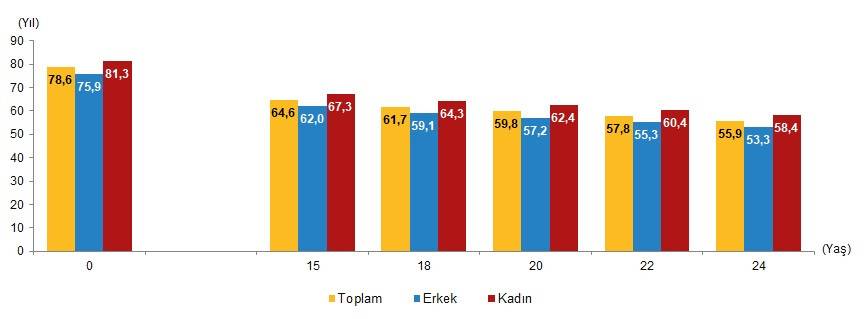 Türkiye'de çalışma çağının başlangıcı olan 15 yaşındaki gençler için kalan yaşam süresinin ortalama 64,6 yıl, erkekler için 62,0 yıl ve kadınlar için 67,3 yıl olduğu görüldü. Diğer bir ifade ile 15 yaşına ulaşan genç kadınların genç erkeklerden ortalama 5,3 yıl daha fazla yaşayacağı tahmin edildi.