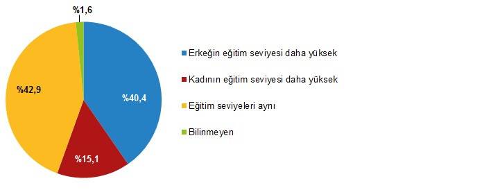 ADNKS sonuçlarına göre genç nüfusun resmi evliliklerinde eşleri arasındaki eğitim farkı incelendiğinde, 2019 yılında genç kadınların %40,4'ünün kendilerinden daha yüksek eğitimli erkeklerle evli olduğu, %15,1'inin ise eşlerinden daha yüksek eğitim seviyesine sahip olduğu görüldü. Eğitim seviyeleri aynı olan genç çiftlerin oranı %42,9 oldu.