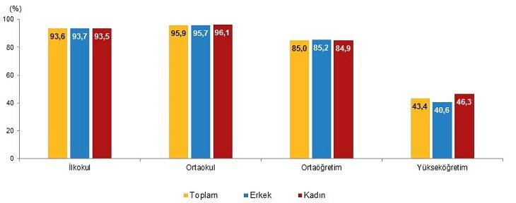 Türkiye'de 2018/'19 öğretim yılında %44,1 olan yükseköğretim net okullaşma oranı, 2019/'20 öğretim yılında %43,4'e düştü. Yükseköğretim net okullaşma oranı cinsiyete göre incelendiğinde, erkeklerde bu oran %41,9'dan %40,6'ya düşerken kadınlarda %46,4'ten %46,3'e düştü.