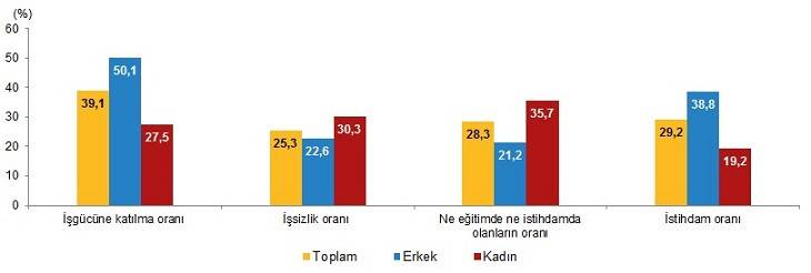 Ne eğitimde ne istihdamda olan gençlerin oranı 2019 yılında %26,0 iken 2020 yılında %28,3 oldu. Genç erkeklerde ne eğitimde ne istihdamda olanların oranı 2019 yılında %18,3 iken 2020 yılında %21,2 olurken genç kadınlarda bu oran 2019 yılında %34,0 iken 2020 yılında %35,7 oldu.