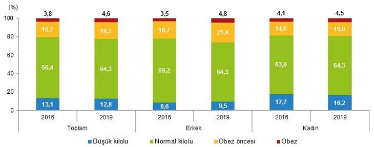 Diğer taraftan, 2016 yılında genç nüfusta normal kilolu olanların oranı %66,4 iken bu oran 2019 yılında %64,3 oldu. Normal kilolu genç nüfus oranı cinsiyete göre incelendiğinde, genç erkeklerde 2016 yılında %69,2 iken bu oran 2019 yılında %64,3, genç kadınlarda ise 2016 yılında %63,6 iken 2019 yılında %64,3 oldu.
