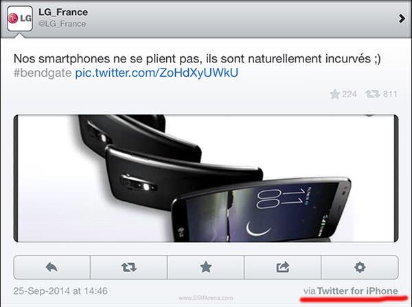 iPhone 6 Plus #Bendgate göndermelerine Güney Koreli LG de katıldı. Mesela LG İngiltere, iPhone 6 Plus'un bükülmesinden yararlanarak G Flex'i öne çıkardı. Apple'a taş attı. Birkaç gün sonra LG Fransa da bu örneği takip etti. Benzer bir tweet mesajı yolladı. Ama resimde görebileceğiniz gibi tweet ironik bir biçimde bir iPhone aracılığıyla gönderilmiş. Cult of Mac sitesi bu durumu fark etti.