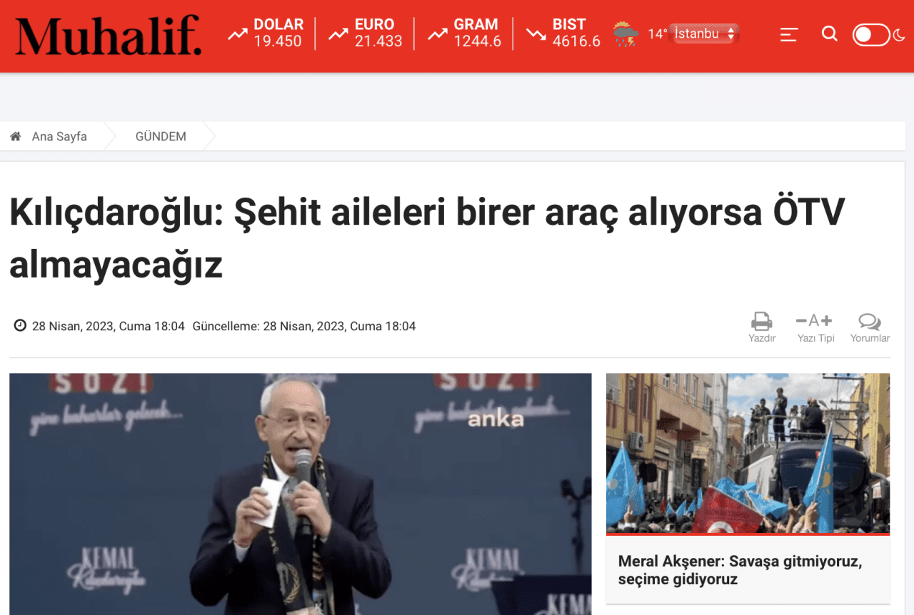 Türkiye, 14 Mayıs'ta yapılacak olan Cumhurbaşkanı ve 28. Dönem Milletvekili Seçimlerine gitmeye hazırlanırken, Millet İttifakı'nın Cumhurbaşkanı adayı Kemal Kılıçdaroğlu, 28 Nisan'da Kocaeli'nde düzenlediği mitingde "Şehit ailelerine ÖTV'siz araç, onlara da sözüm var. Şehit aileleri var, onlar birer araç alıyorsa ÖTV almayacağız." dedi.