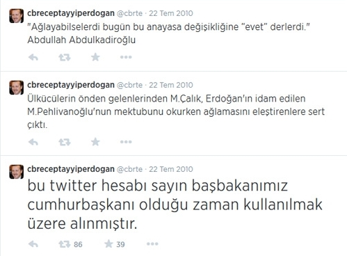 Hesaptan ilk atılan tweete, “bu twitter hesabı sayın başbakanımız cumhurbaşkanı olduğu zaman kullanılmak üzere alınmıştır.” İfadeleri yer alırken mesajın paylaşıldığı tarihin ise 22 Haziran 2010 olduğu görüldü.