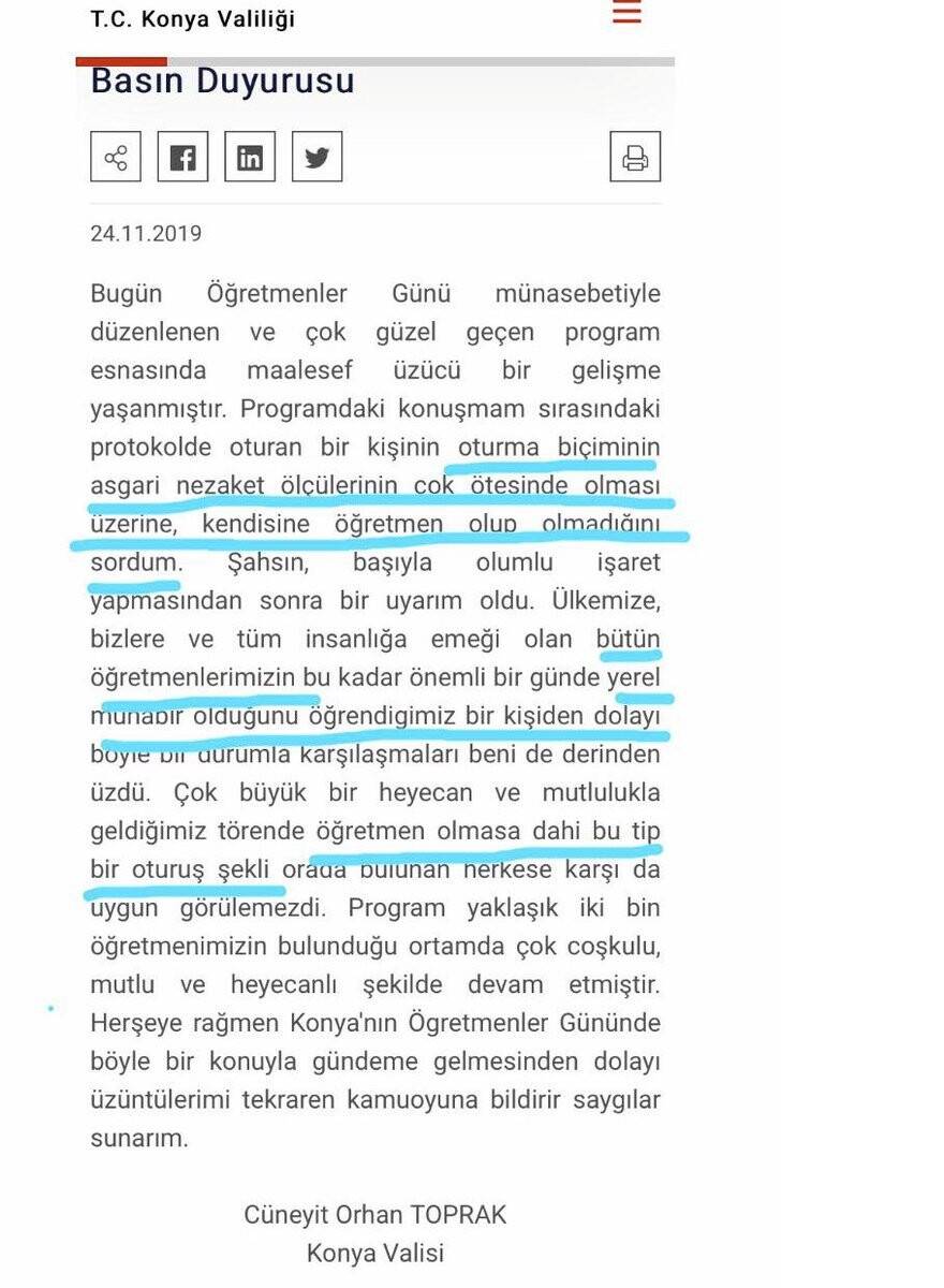 Konya’da Selçuklu Kongre Merkezi’nde gerçekleştirilen 24 Kasım Öğretmenler Günü programına katılan Vali Cüneyit Orhan Toprak, konuşma yaparken bacak bacak üstüne atan bir öğretmeni fırçaladı. Konuşma yapmak için kürsüye çıkan Toprak, bir öğretmenin bacak bacak üstüne attığını fark etti.
